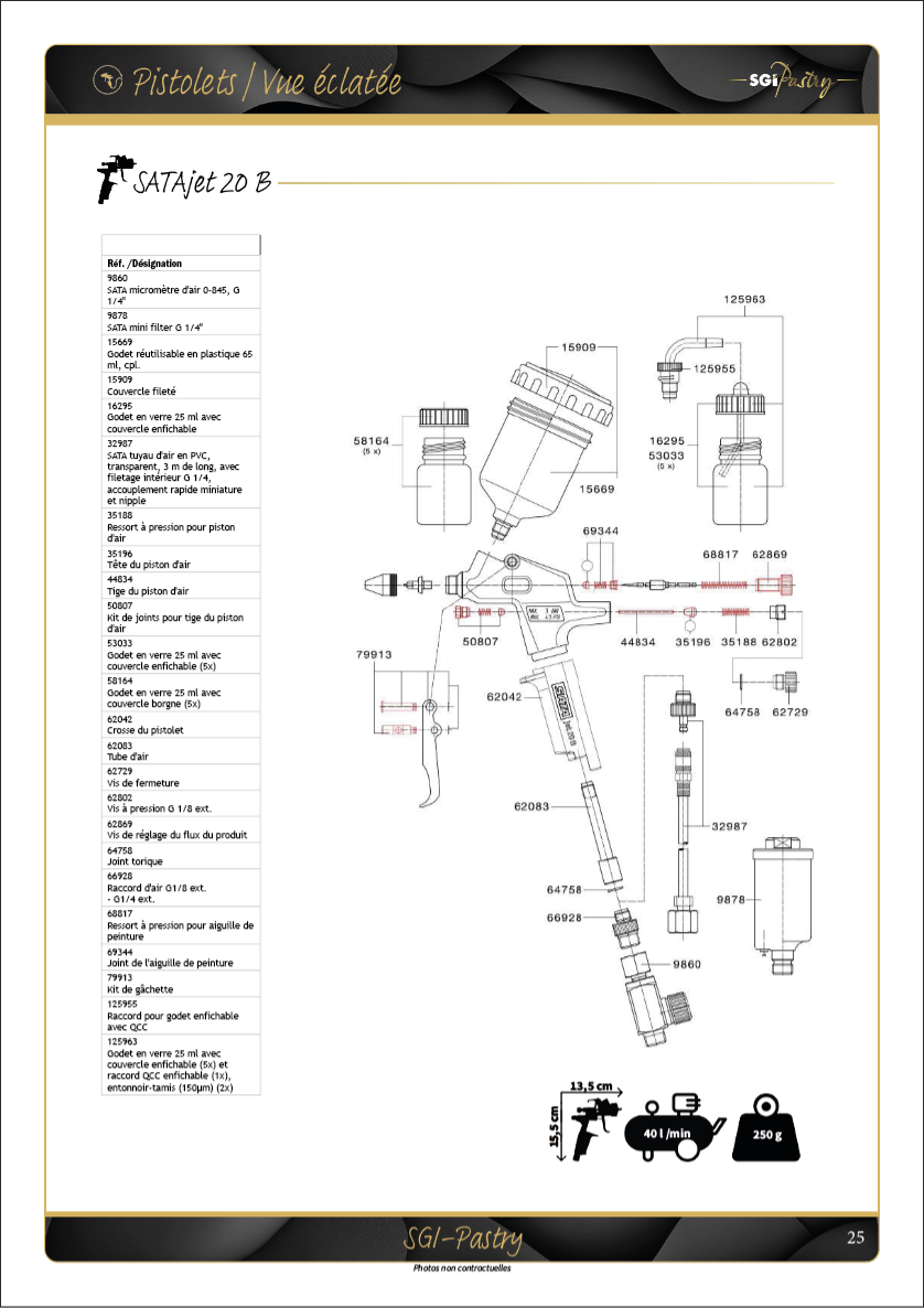 Recommandé pour l'application de beurre de cacao. Idéal pour les décors, sculptures, dessins de précisions et pour la pulvérisation dans les moules.